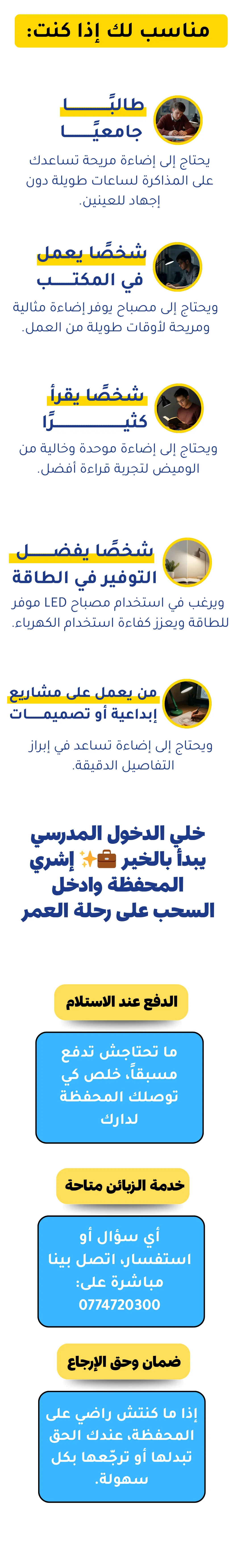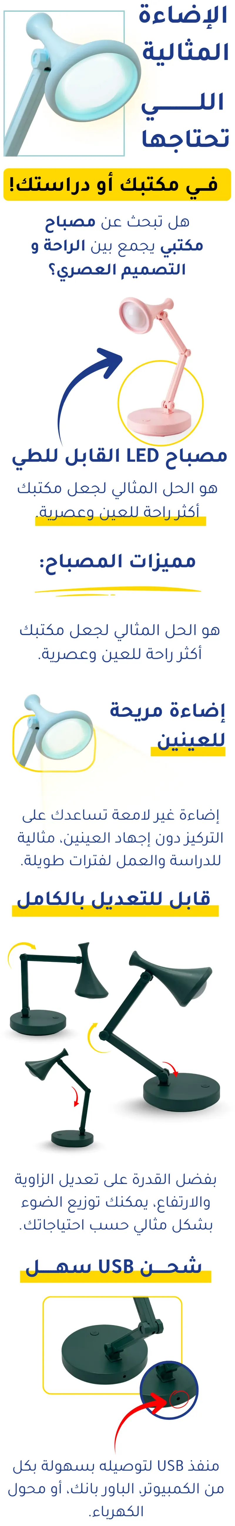 احصل على الإضاءة المثالية لمكتبك مع مصباح LED القابل للطي. يوفر لك إضاءة مريحة للعينين بدون وميض، تصميم أنيق بأربعة ألوان عصرية، ومنفذ USB للشحن السهل. مثالي للطلاب، العاملين من المنزل، والقراءة اليومية.